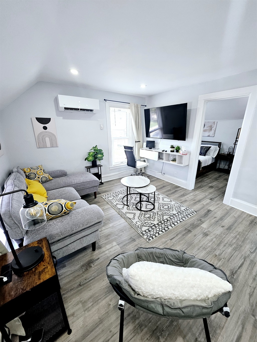 Bright, open-plan living area with a cozy sofa, chair, and wall-mounted Smart TV for entertainment